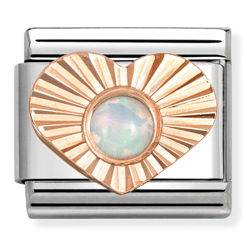 Composable Classic DIA HEART STONES in steel & 9ct r/gold Heart with Etched detail & White Opal