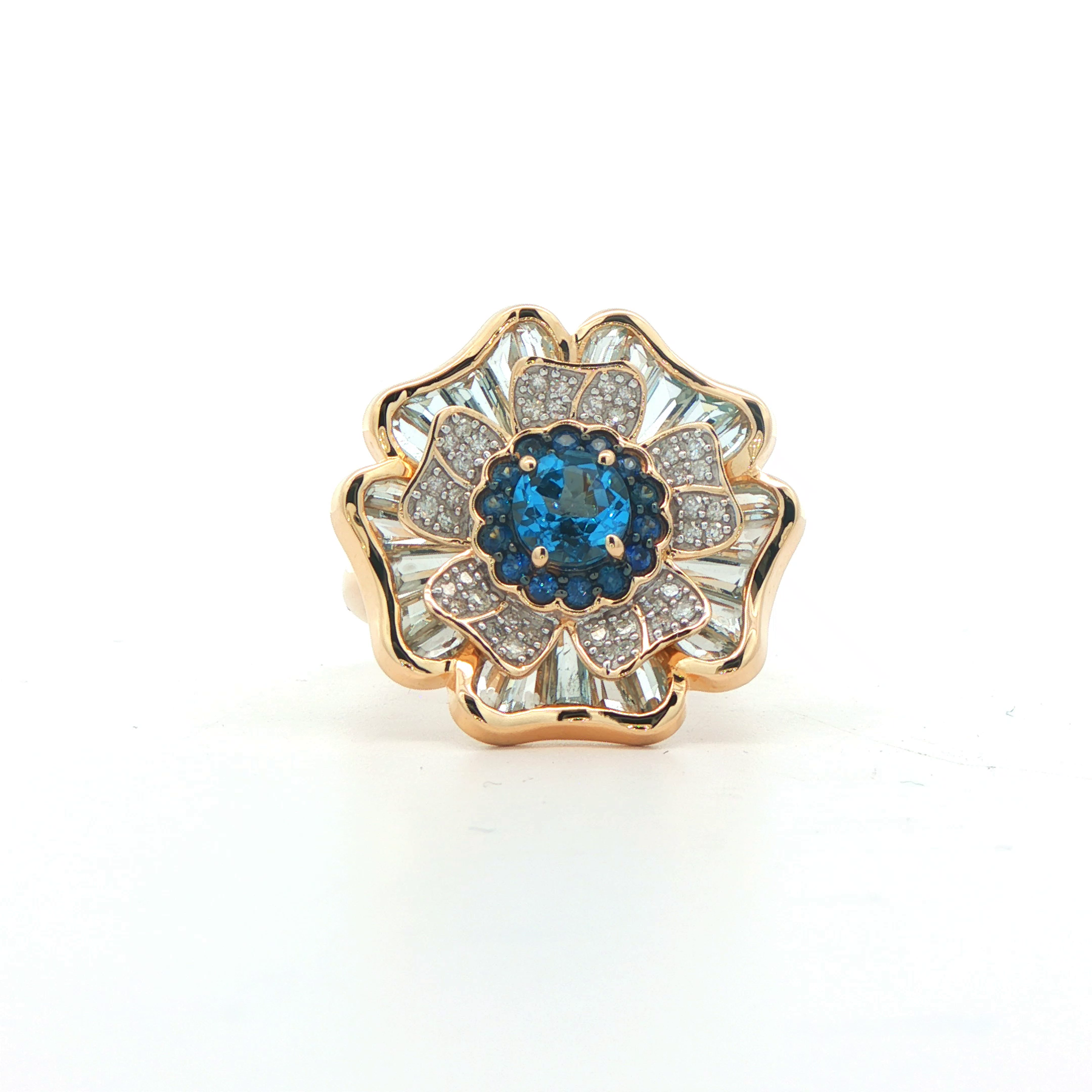 Embrace elegance with this yellow gold cocktail ring, showcasing a mesmerizing round-cut blue topaz, Sapphires and Diamonds. Making it a stunning statement piece. excellent polish, and symmetry enhance its allure, making this ring an exquisite addition to any jewellery collection.