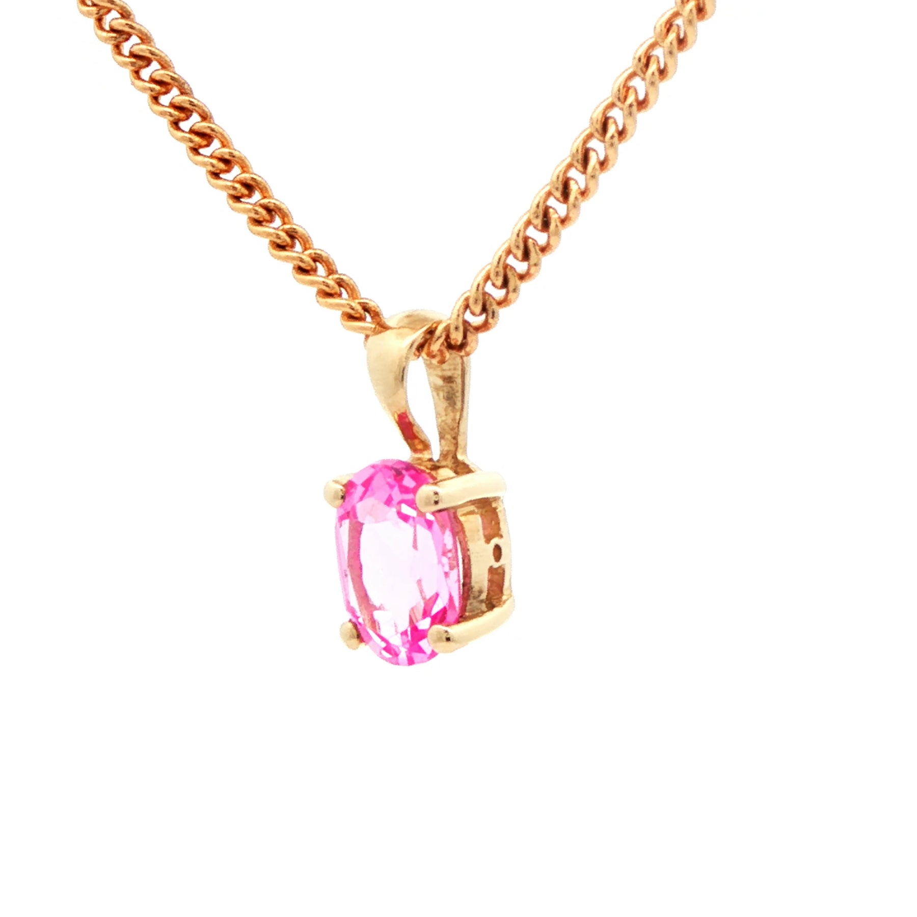 Embrace timeless elegance with this exquisite yellow gold charm necklace. Featuring a captivating oval-cut lab sapphire gemstone, radiating a rich pink hue, meticulously set to enhance its brilliance. The charm's design and the stone's impeccable cutting style create a harmonious blend of classic charm and modern sophistication. A statement of refined taste and enduring beauty.