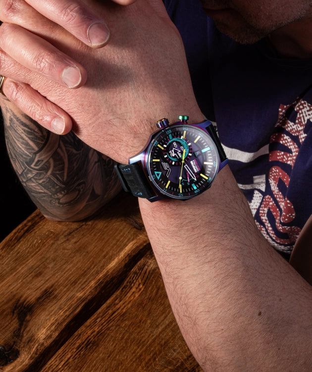 A robust 47 mm case with a rugged refined design, offers maximum protection against impacts and can withstand pressures of up to 20 BAR. It has a large complicated multi-layered dial. Luminescent indexes and skeletonized hands, ensuring excellent visibility even in the bright sun or the darkness of the Polar night. "Polar Night" models has a special Rainbow PVD coating that makes each piece unique with its own pattern.
